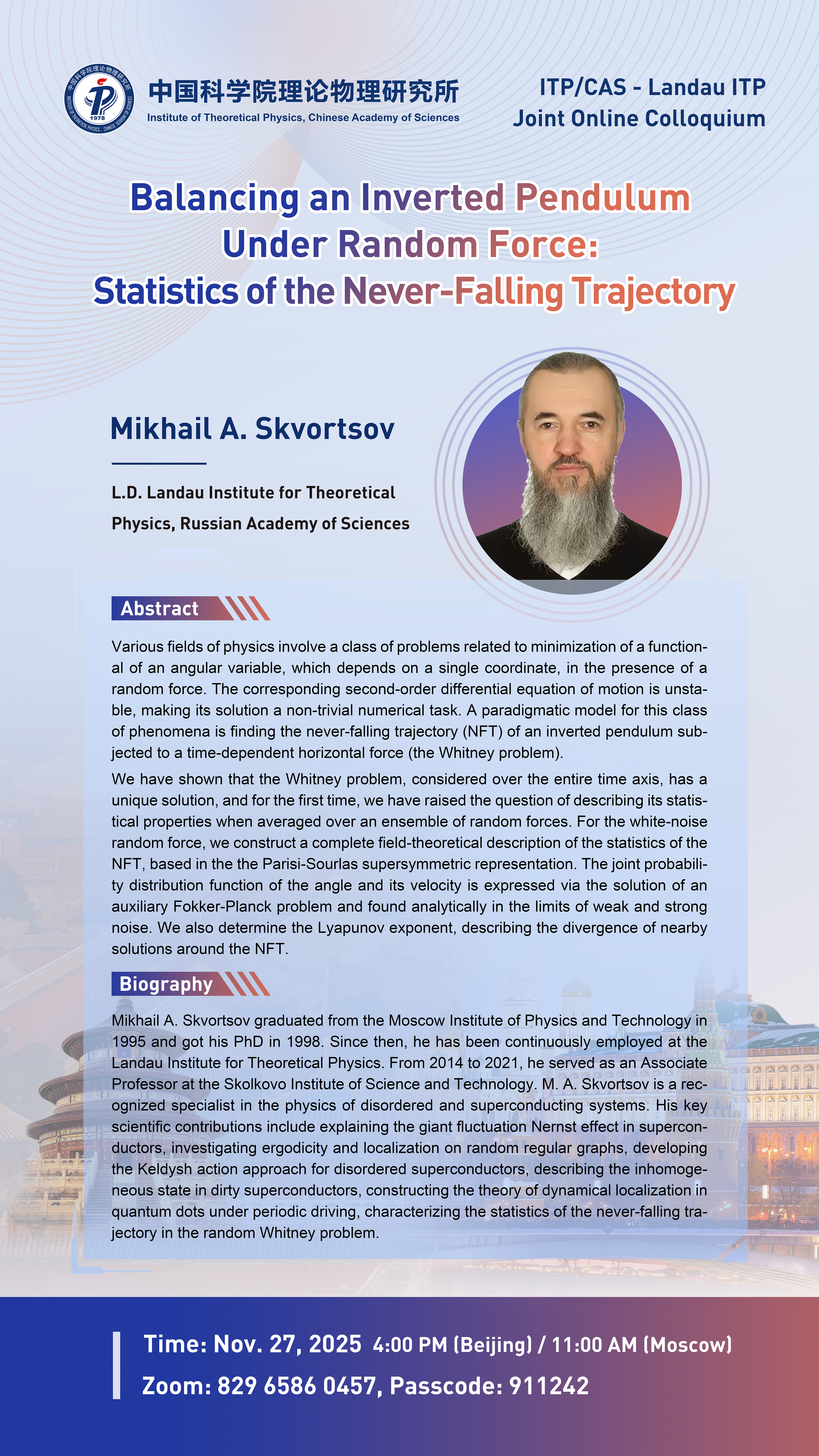 Mikhail A. Skvortsov graduated from the Moscow Institute of Physics and Technology in 1995 and got his PhD in 1998. Since then, he has been continuously employed at the Landau Institute for Theoretical Physics. From 2014 to 2021, he served as an Associate Professor at the Skolkovo Institute of Science and Technology. M. A. Skvortsov is a recognized specialist in the physics of disordered and superconducting systems. His key scientific contributions include explaining the giant fluctuation Nernst effect in superconductors, investigating ergodicity and localization on random regular graphs, developing the Keldysh action approach for disordered superconductors, describing the inhomogeneous state in dirty superconductors, constructing the theory of dynamical localization in quantum dots under periodic driving, characterizing the statistics of the never-falling trajectory in the random Whitney problem.